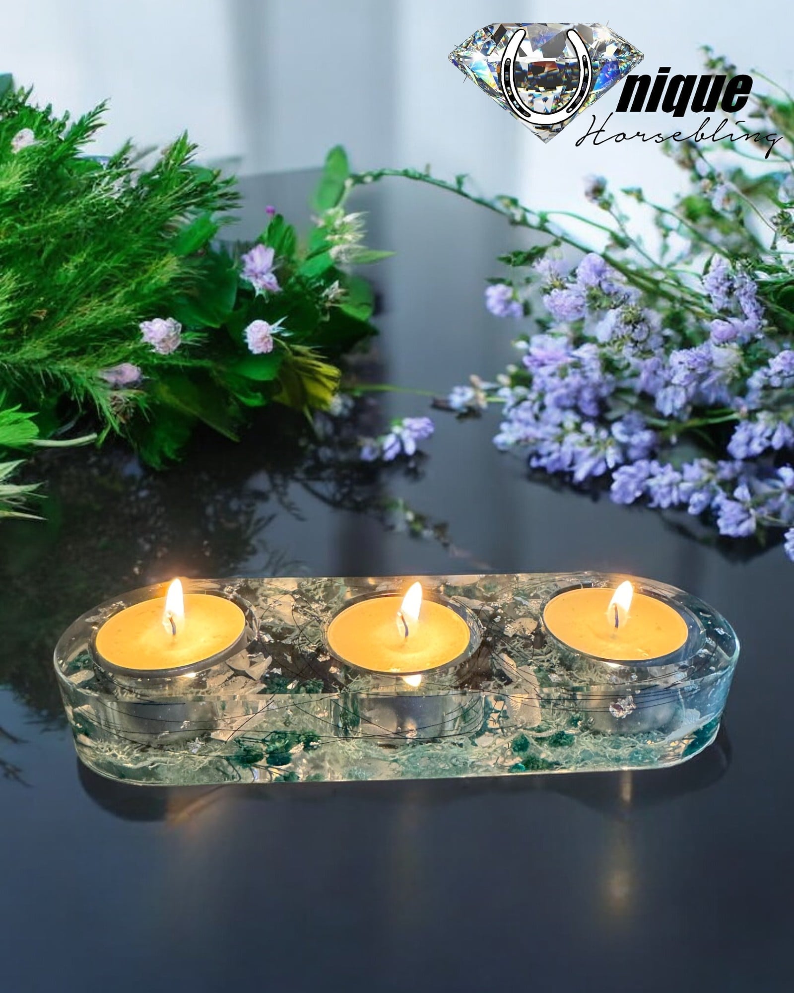 Hair, ashes, or teeth are embedded in a form designed to hold 1, 2, or 3 tealight candles.