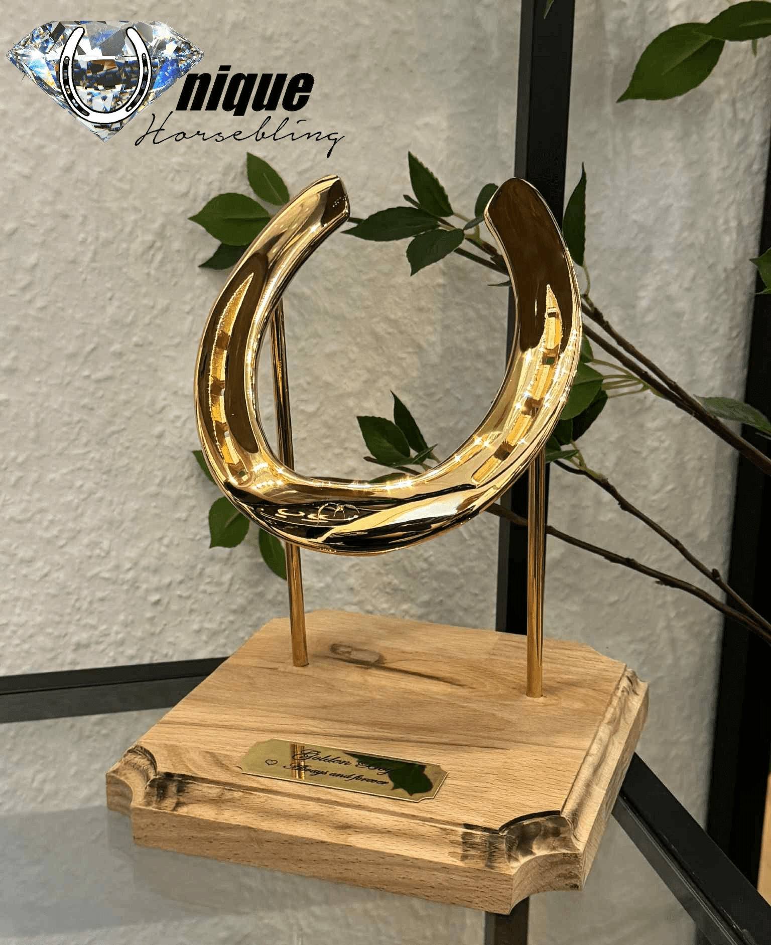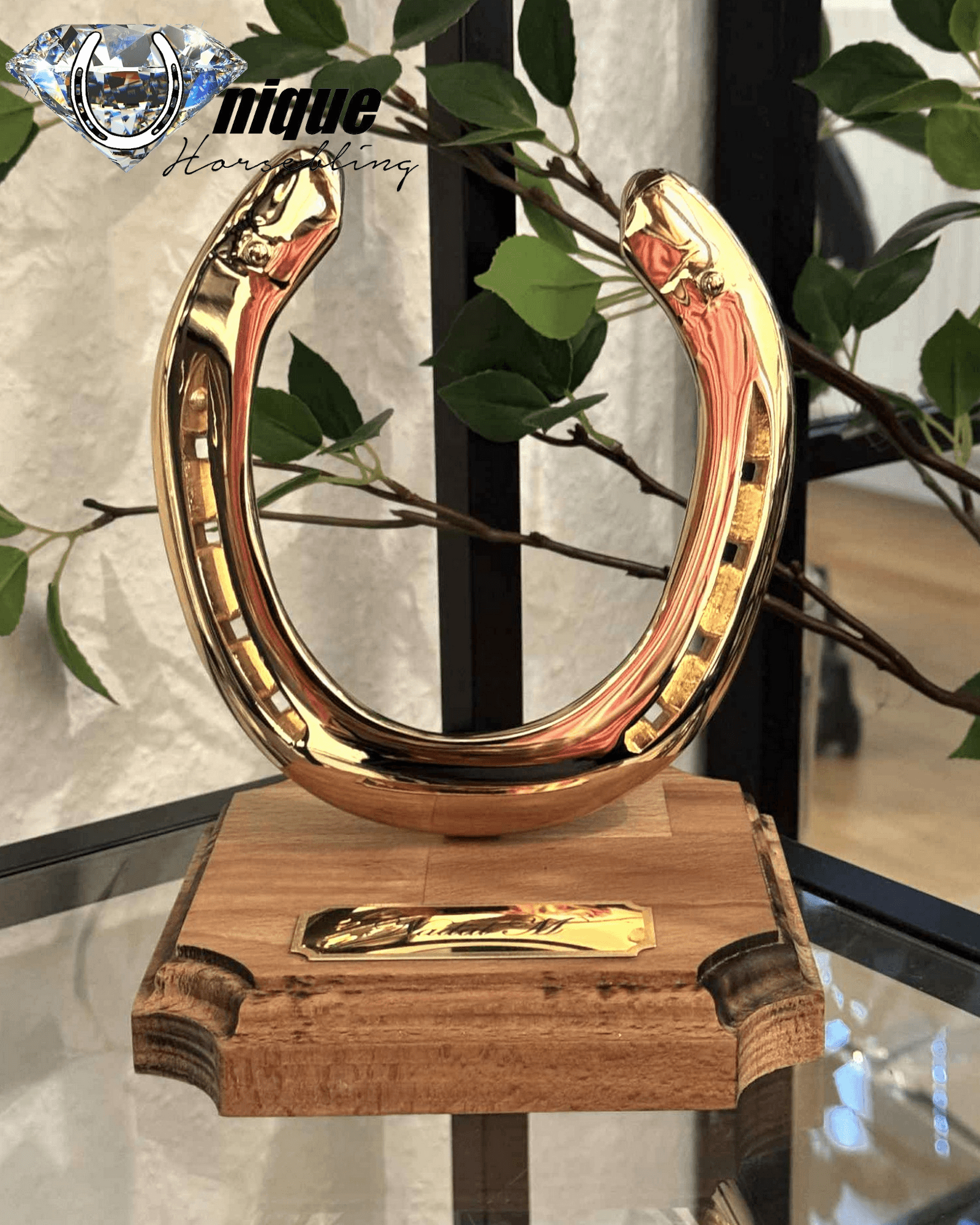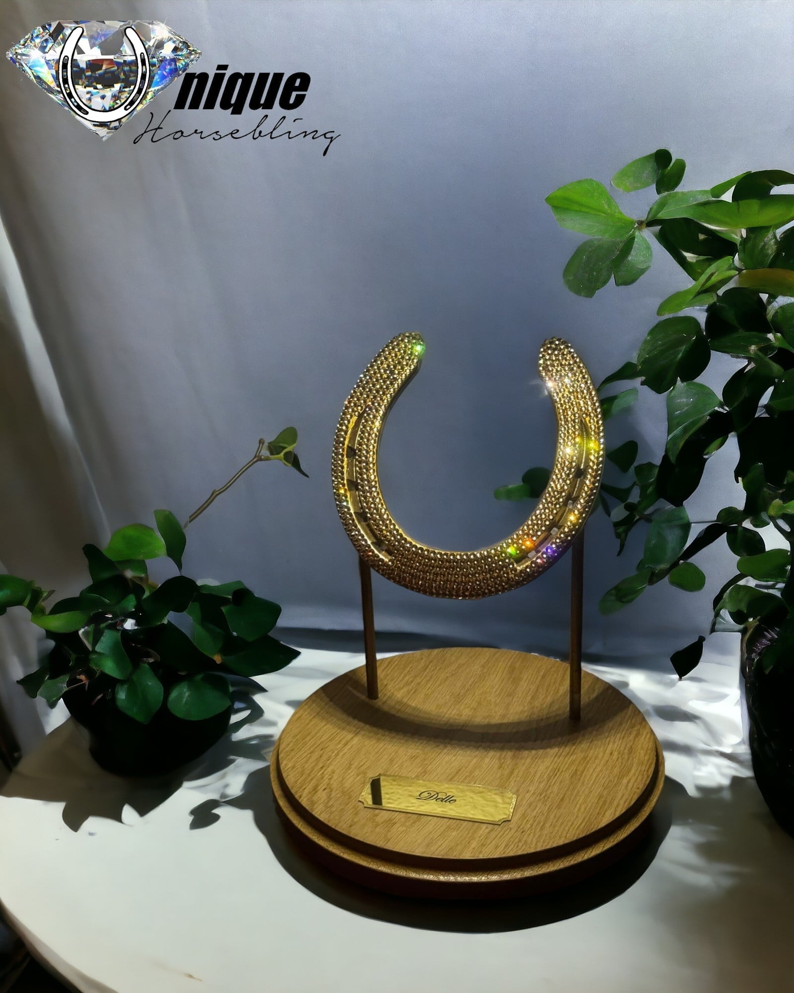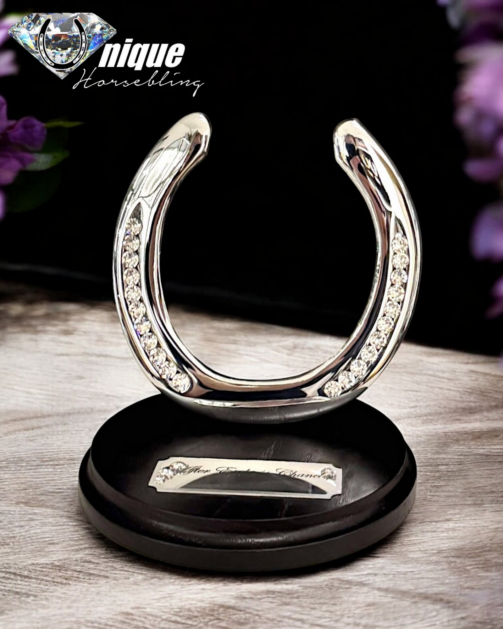From the very first decoration of horseshoes, we have used this type of engraved plaque, shiny in the middle with a brushed edge all around. They are made of aluminum and available in the following colors: Gold, Silver, and Copper. There are several font options, but the one we use 99% of the time is Edwardian Script, which we find the most elegant.