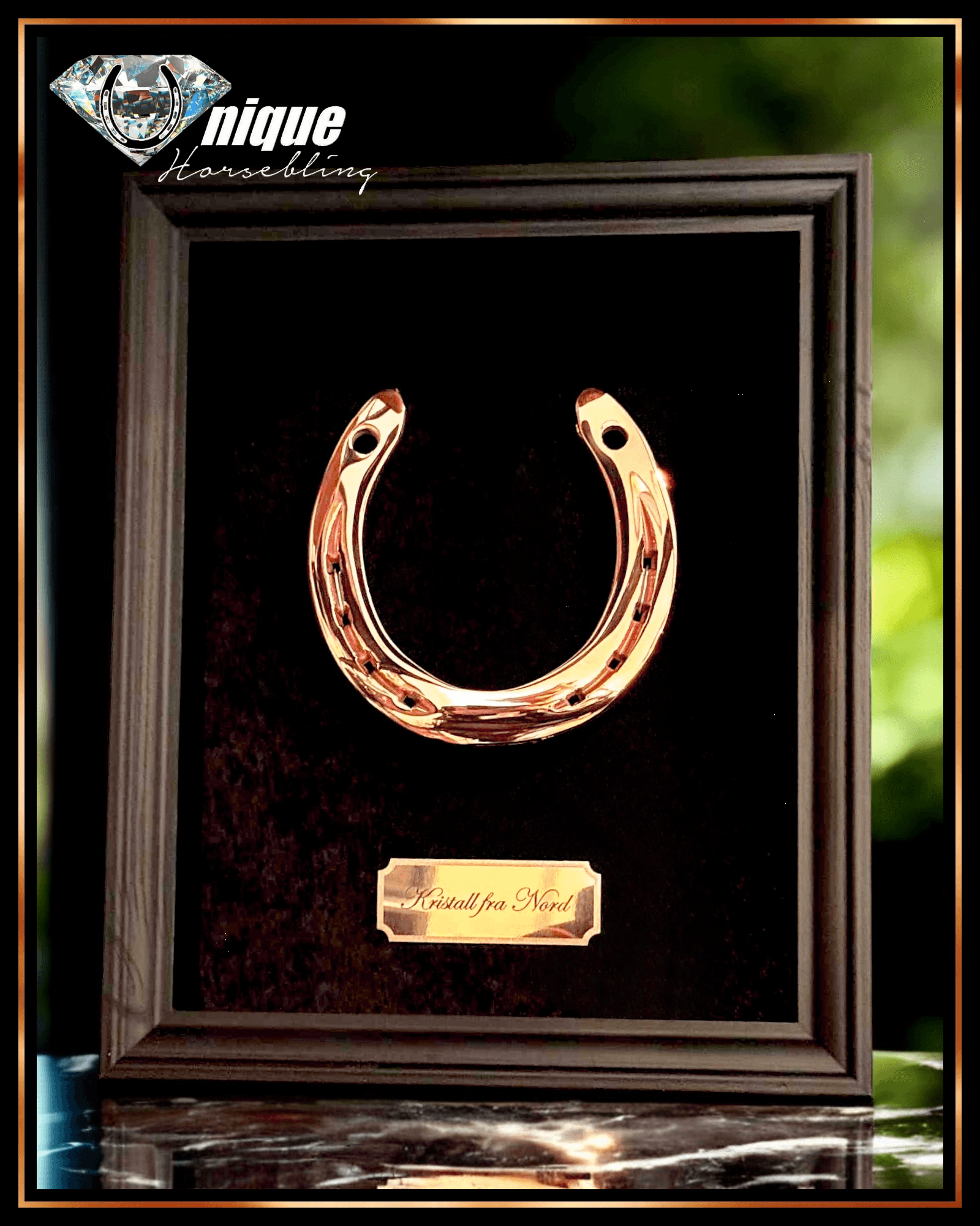Goldsmith plated horseshoe coated with genuine copper, fitted in a frame with an engraved sign.