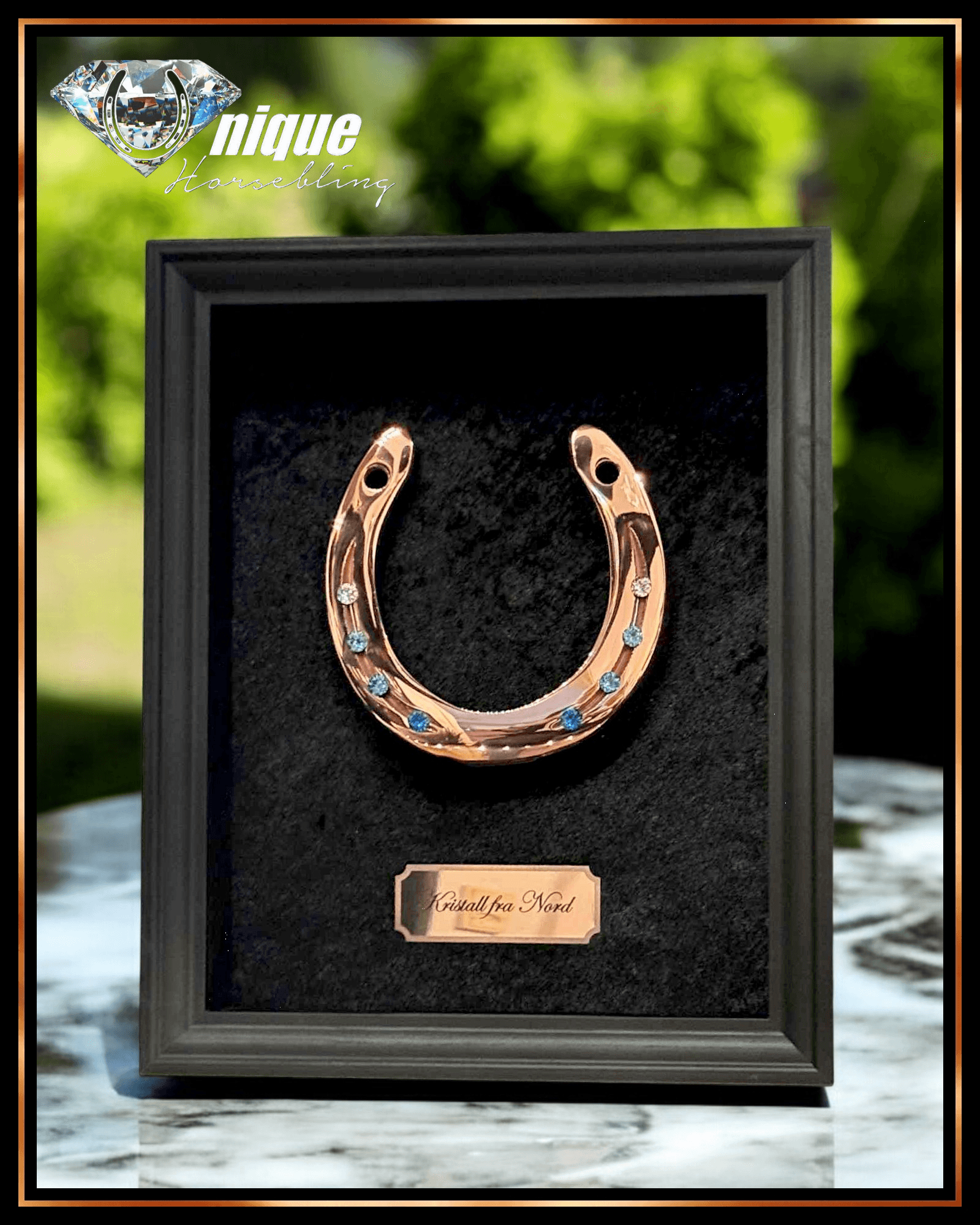 Industrially copperplated horseshoe, decorated with large, high - quality rhinestones in your choice of colors, fitted in a frame with engraved sign.