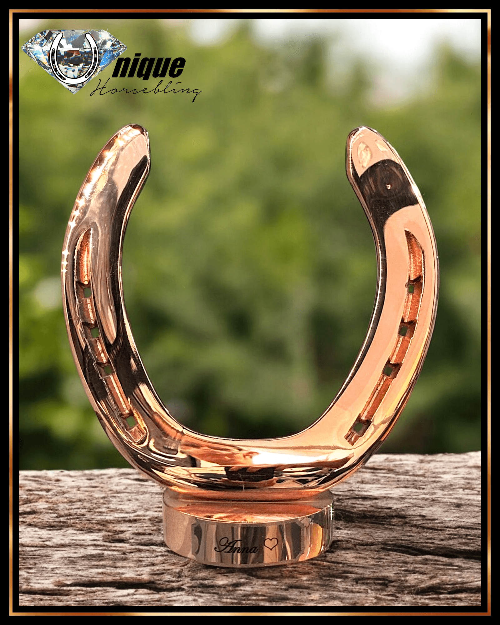 Industrially copperplated horseshoe, fitted on a wooden base with engraved sign.