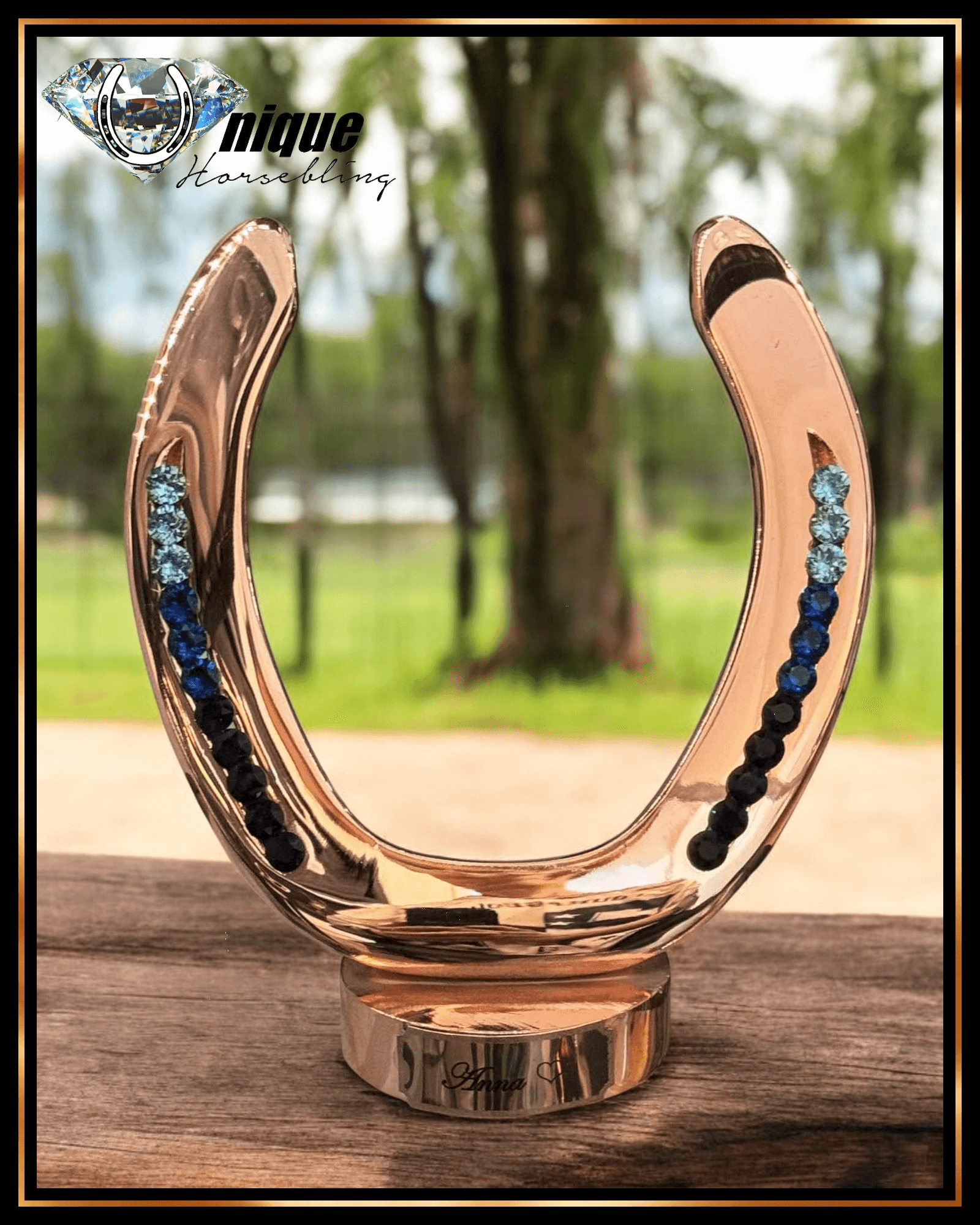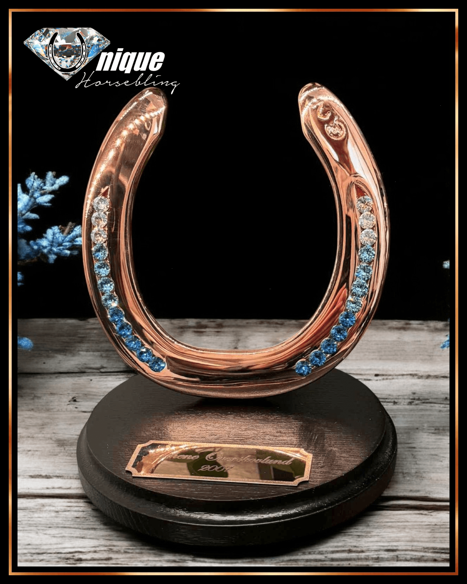 Industrially copperplated horseshoe, decorated with large, high - quality rhinestones in your choice of colors, fitted on a wooden base with engraved sign.