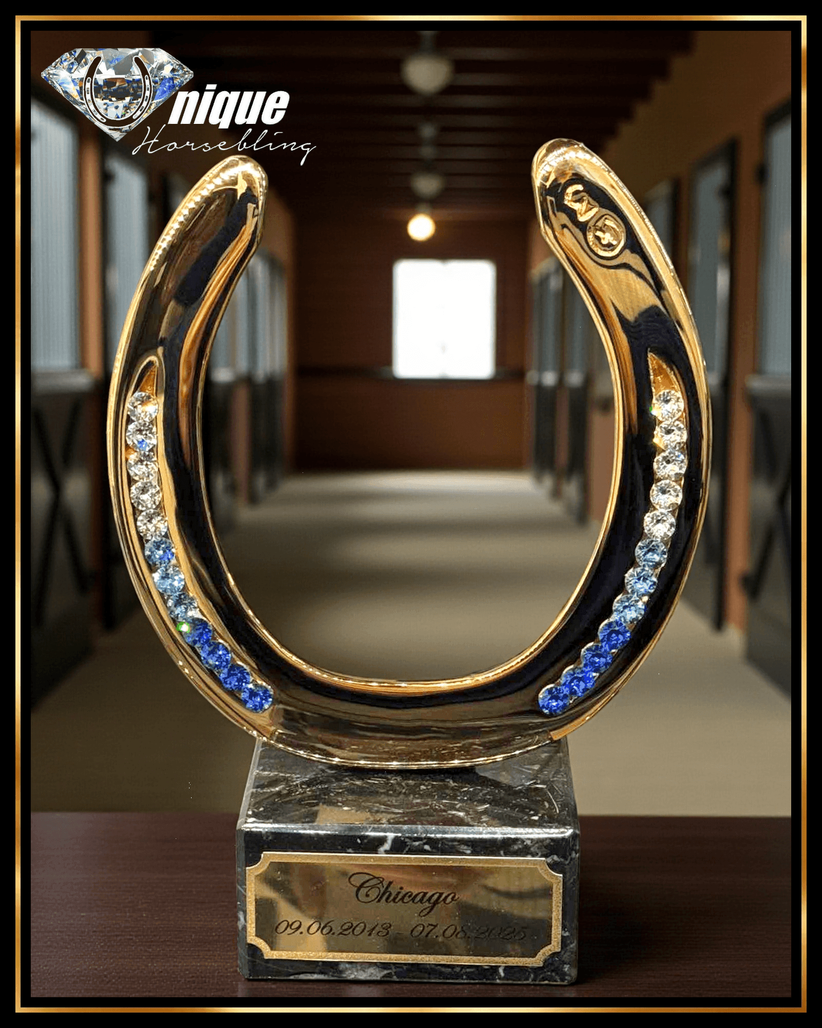 Industrially 24 carat gold - plated horseshoe, decorated with large, high - quality rhinestones in your choice of colors, fitted in a frame with engraved sign.