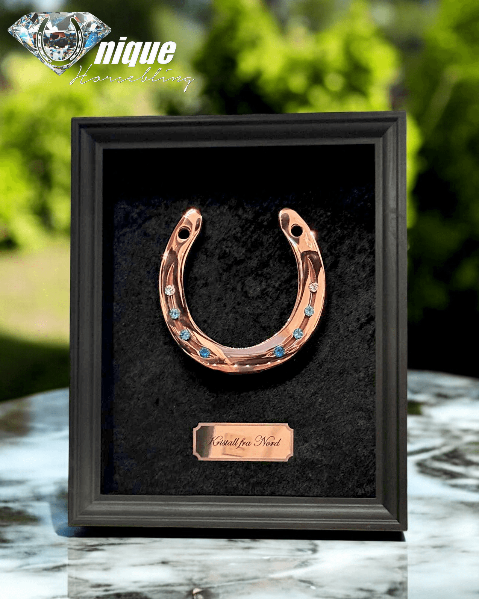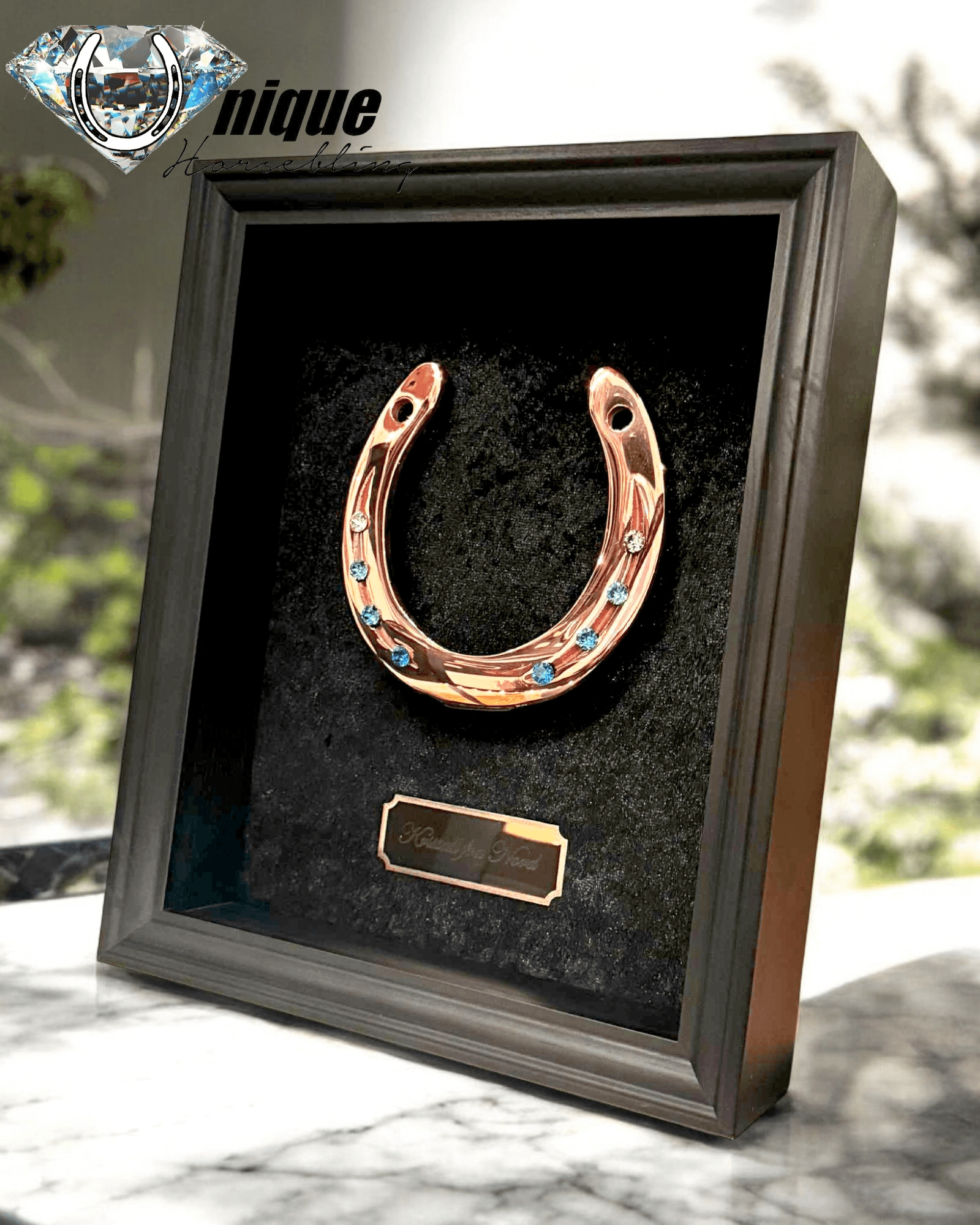 The horseshoe is fitted in a beautiful frame.