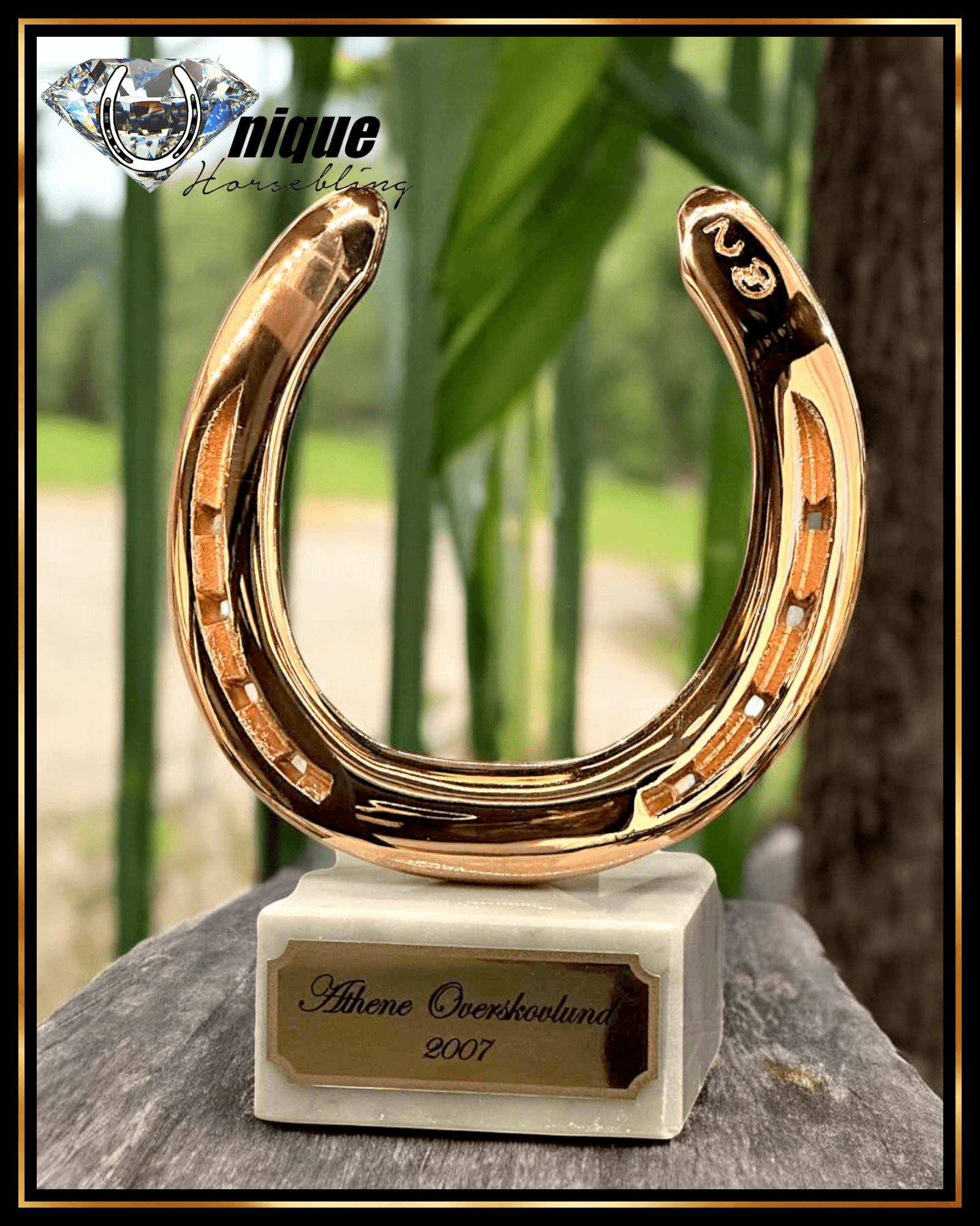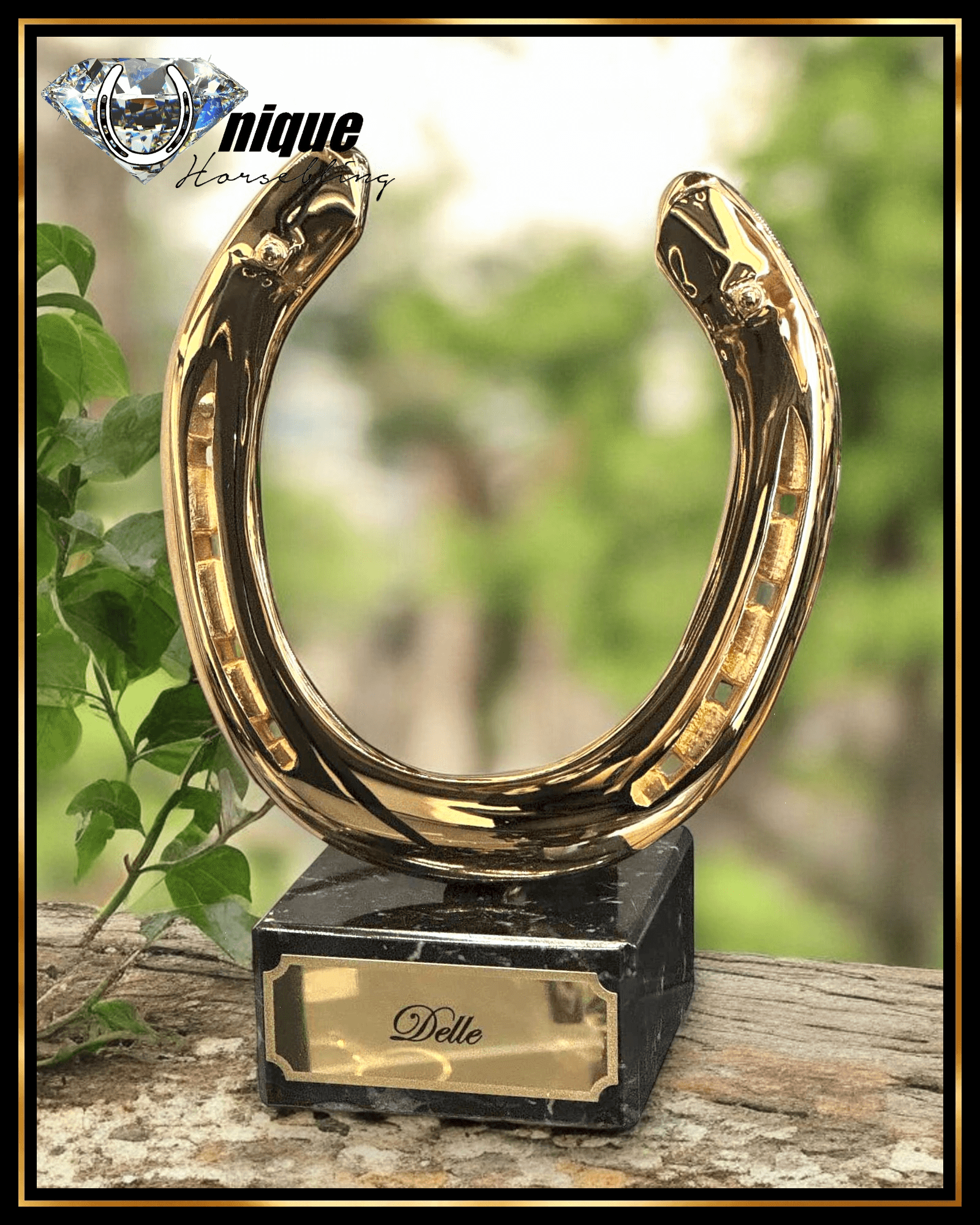 Mirror - polished horseshoe industrially coated with genuine 24 - carat gold, fitted on a marble base with an engraved sign.