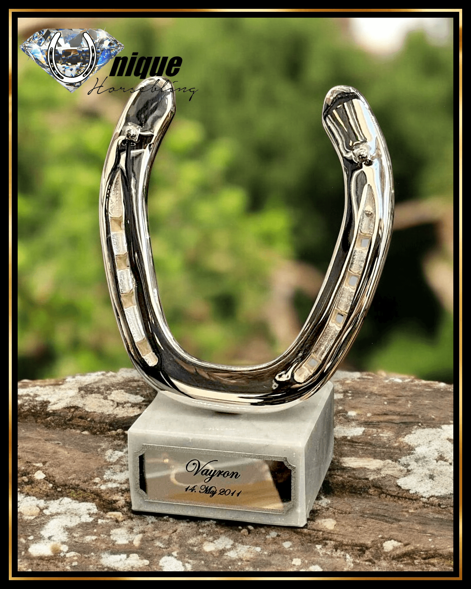 Mirror - polished horseshoe, industrially plated with genuine silver, fitted on a marble base with engraved sign.