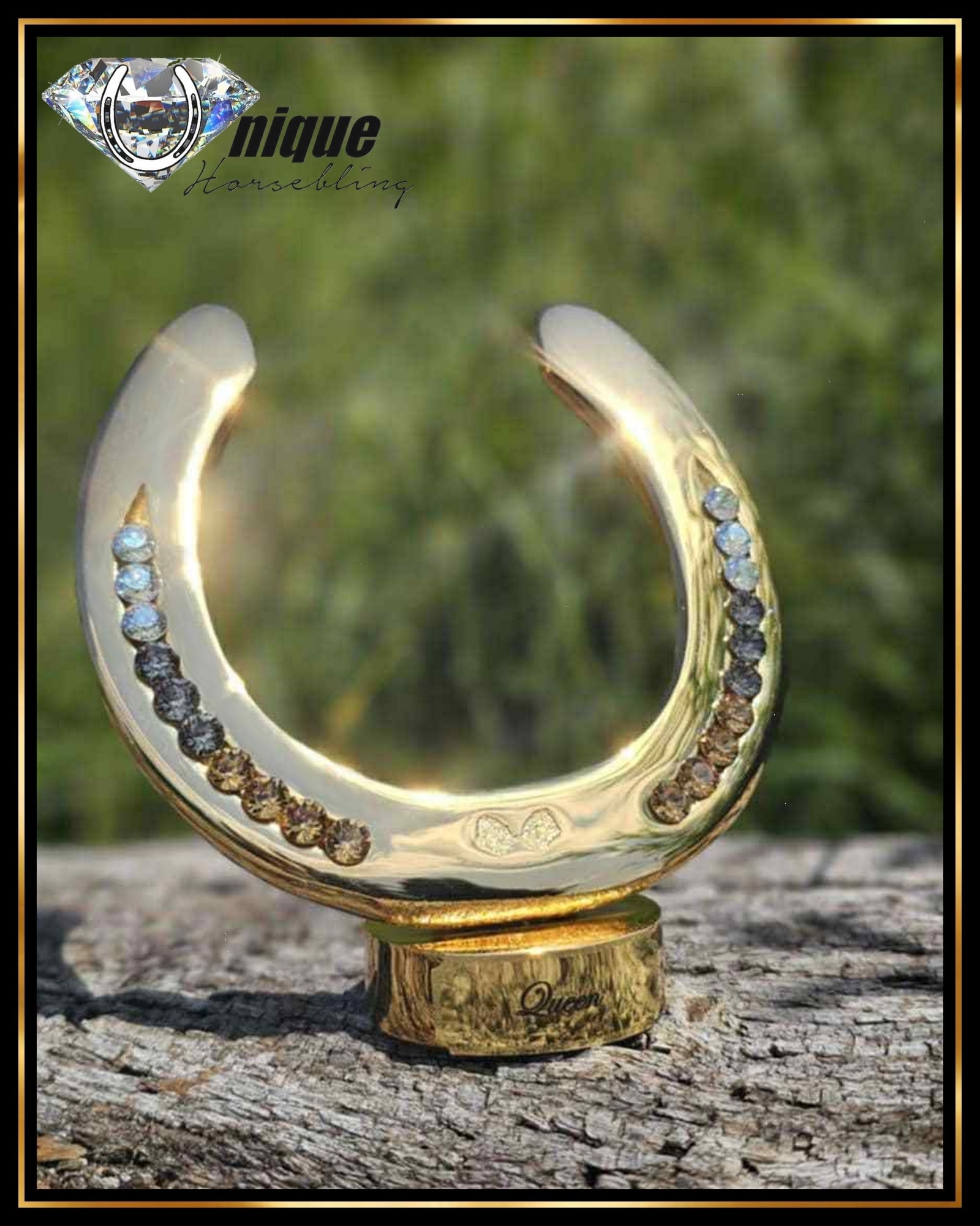 Mirror - polished horseshoe, industrially plated with genuine 24 - carat gold and decorated with large rhinestones in the nail grooves, fitted on a metal base with engraved sign.